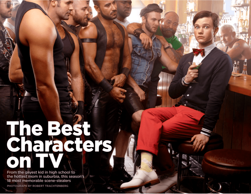 Could it be because the photo depicts NOT Chris Colfer, the 20 year-old GLEE star (still underage in most states), but of Kurt Hummel – the 16 year-old High School sophomore, sitting in a gay leather bar, surrounded by muscular, hairy (and gorgeous) men, drinking a Green Apple Martini (should that be capitalized?), frightfully (anxiously?) awaiting to be gang-banged. It’s a little unsettling.